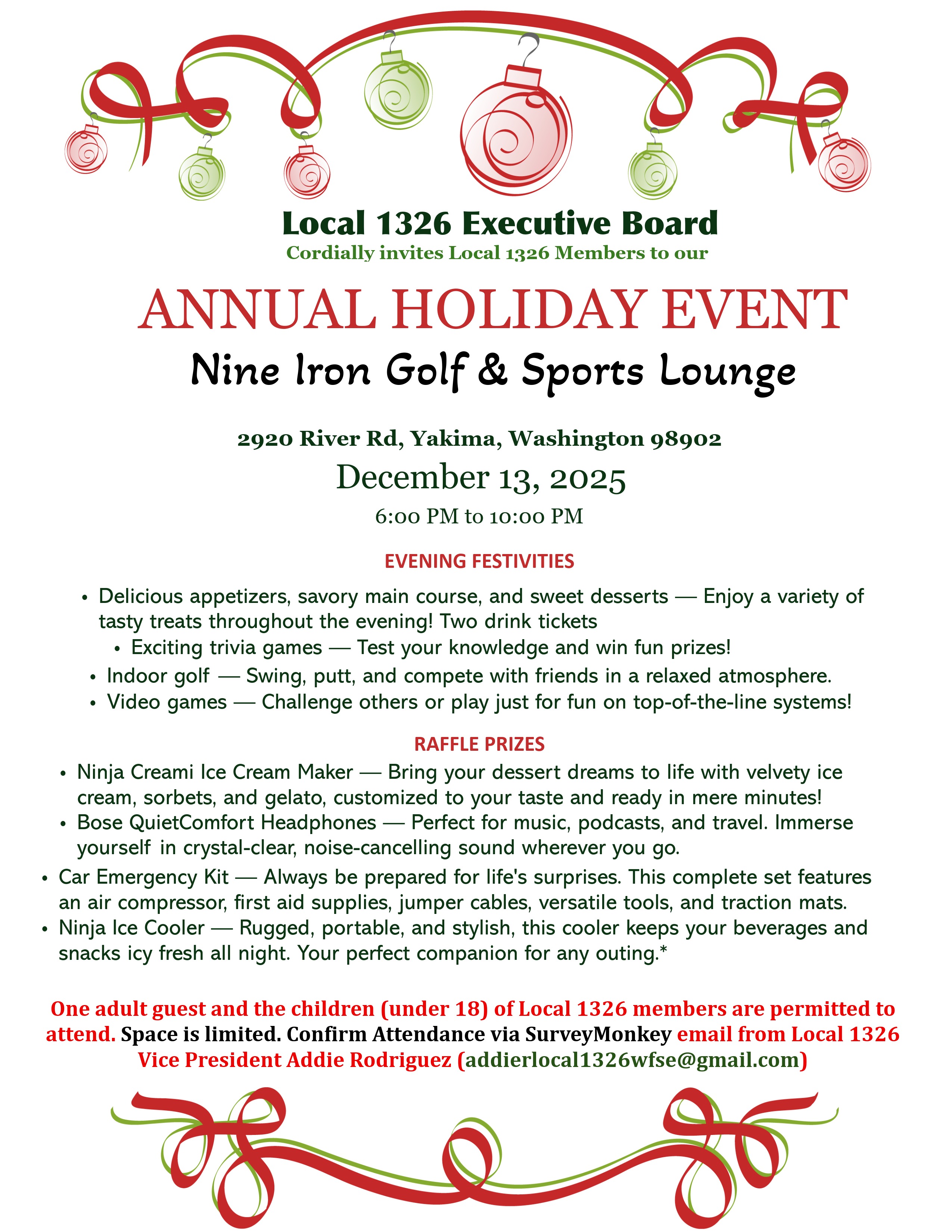 News December Holiday Membership Meeting Ashley Bolen Dec. 1, 2025 Social share icons Please join us on December 13, 2025 6pm to 10pm at Nine Iron Golf 2920 River Rd, Yakima, Washington 98902